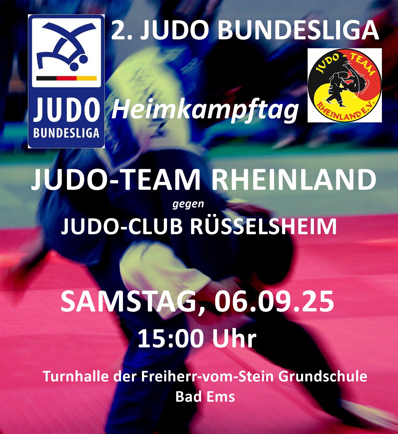Am Samstag, den 06.09.25 gastiert der Judo-Club Rüsselsheim in Bad Ems zur Judo Bundesliga. In der zweiten Liga empfängt das Judo-Team Rheinland in der Turnhalle der Freiherr-vom-Stein Grundschule die Gäste aus der hessischen Autobauerstadt. Los geht es bereits um 15:00 Uhr.